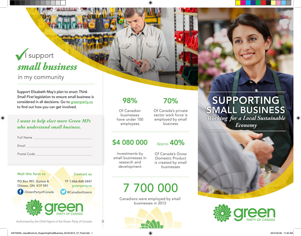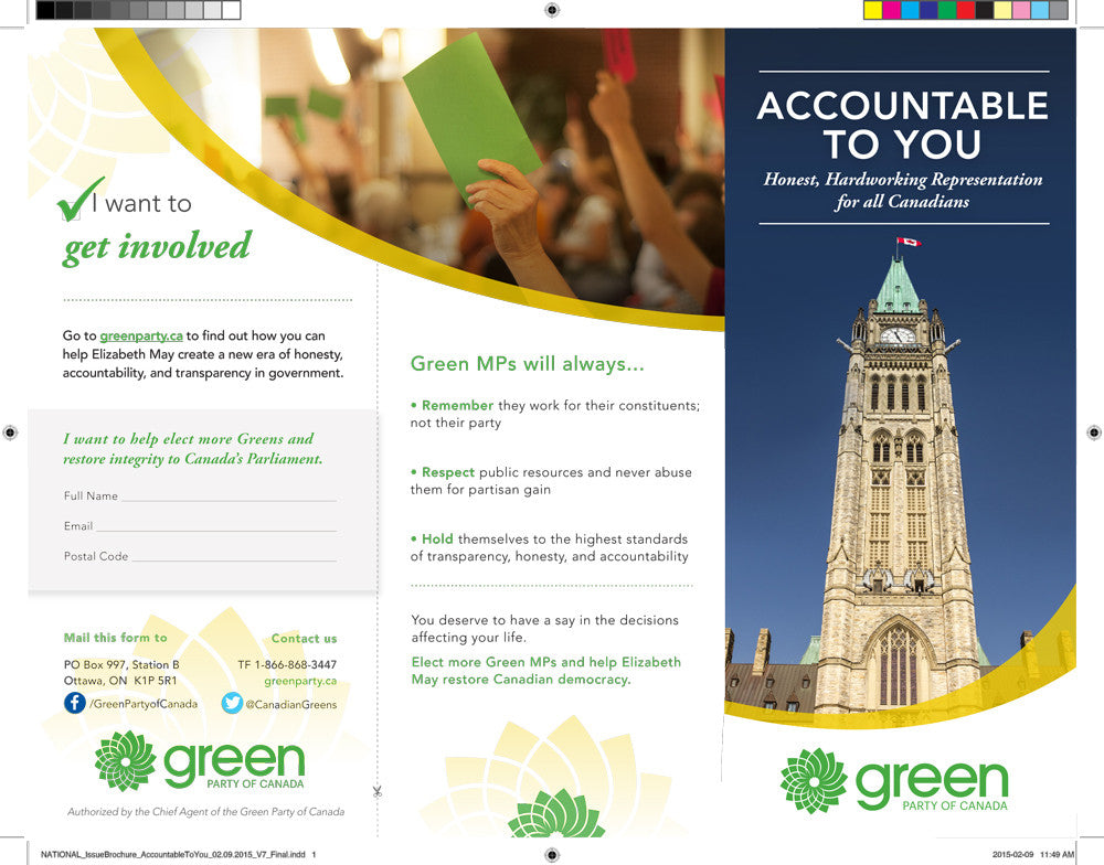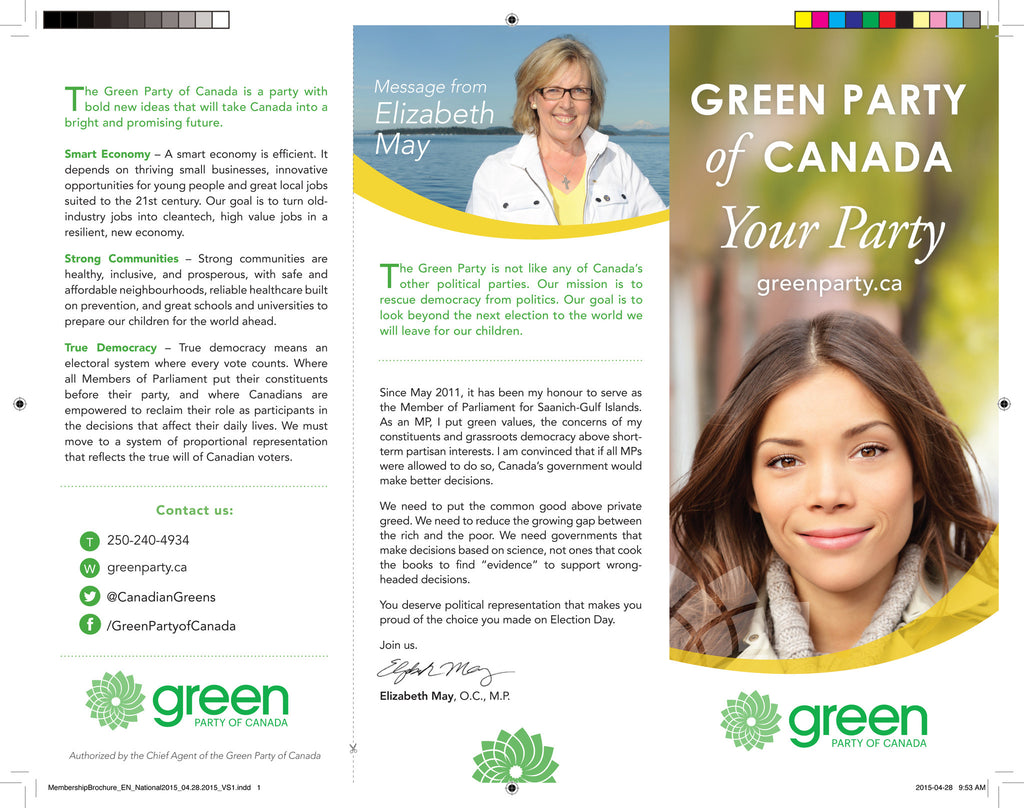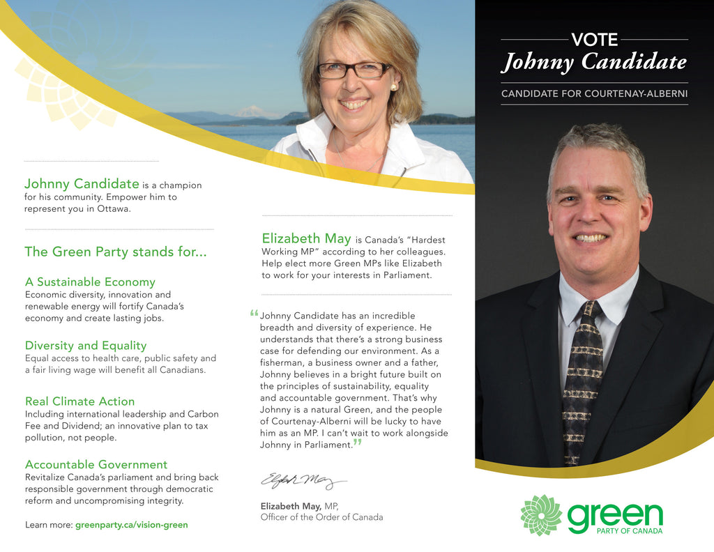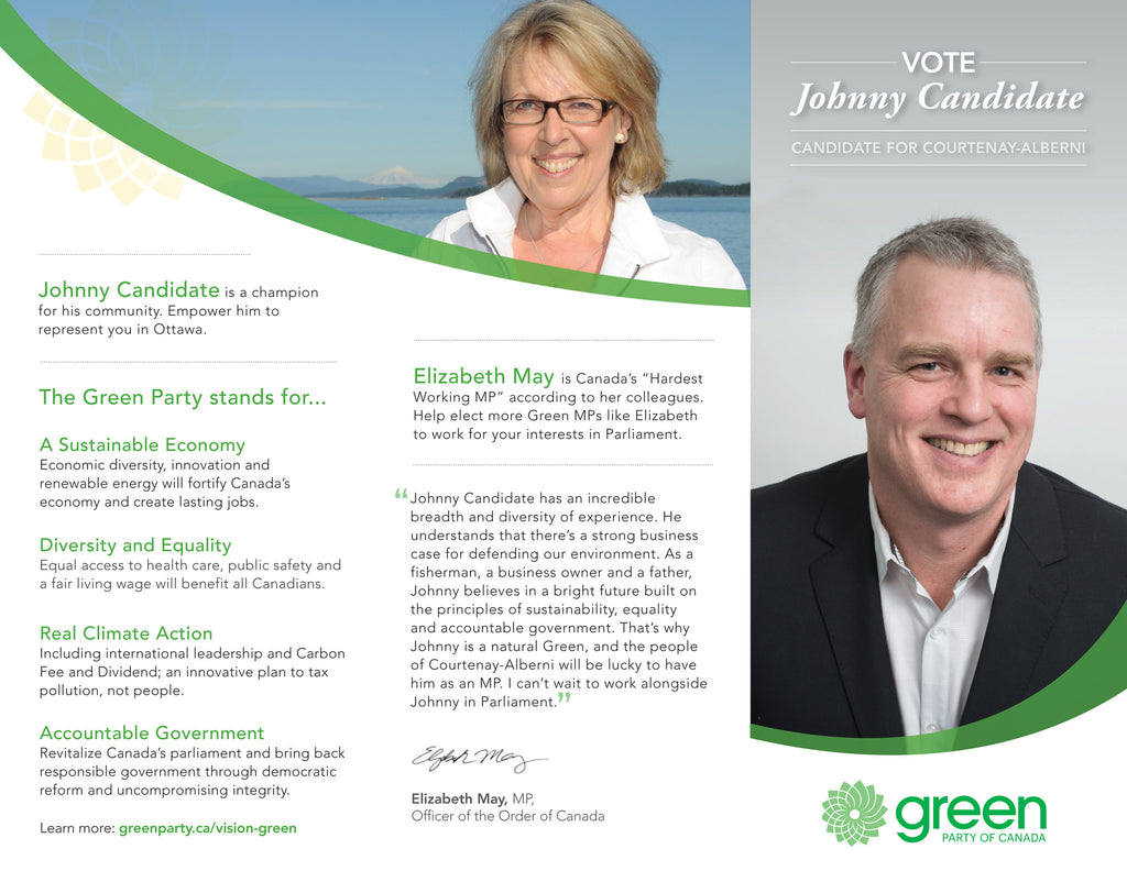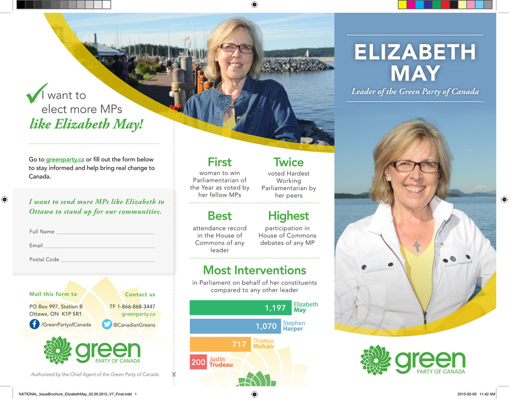 Send a Green message to every household and apartment in the riding. Introduce the new candidate, tell voters more about Elizabeth's achievements, raise some needed funds. From a defined mailing target area GPC Gear will print, pack and post your candidate's trifold. We will insert your candidate's photo and custom text in the template and provide a proof to confirm. We will also confirm the mailing details before proceeding. Call 905-586-1059 for more information. Pricing here is for the printing of a GPC trifold on Enviro 100% Recycled stock plus unaddressed admail postal delivery to 34,000 voters in a specific riding. Also includes 4,000 copies for the campaign office, canvassing and event tables.