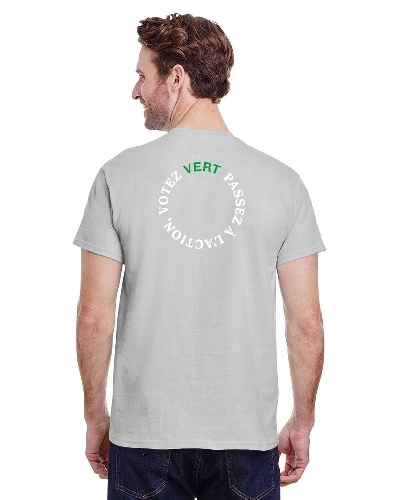 Parti Vert Black, Sand or Ash Grey T - Parti Vert logo on front, Vote Vert, Passez A L'Action on back